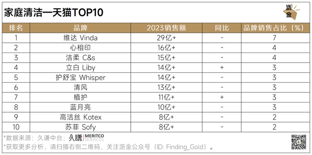 从品牌TOP10榜单来看,维达、心相印等纸品品牌占据较多席位。此外,清洁/洗涤剂类品牌在三大平台榜单中也占有一席之地。