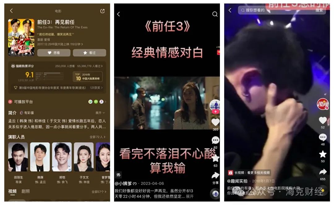 《前任3》在抖音、快手等平台发布的宣传视频,谈不上有多高的技术含量,扩散效果却极佳。这些视频大致可分为三类:一是“痛哭”,包括影院内的普通观众痛哭、情侣痛哭、影院保安痛哭等;二是对片中部分桥段的模仿,比如吃芒果、手势舞等;三是与分手、前任等主题相关的衍生视频。