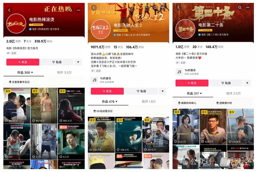 反驳这种评论的人则会列出数据:以抖音官方账号为例,截至2月26日海克财经本文发稿,《热辣滚烫》官方号发布了300条视频,同档期的《飞驰人生2》发布了478条,《第二十条》发布了317条。单论数量,《热辣滚烫》谈不上“营销太重”。