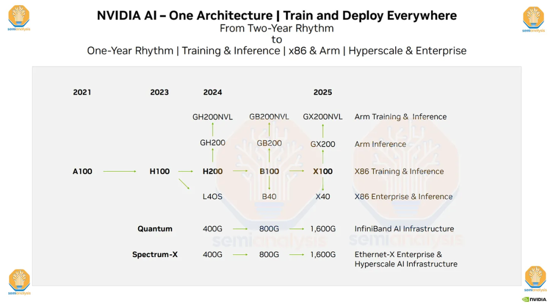 但是这里有两个误区,第一个误区是,英特尔和AMD这两款芯片的发布时间比A100都要晚一年,他们真正对标的对手,其实应该是英伟达在2022年初发布的H100,而现在英伟达的芯片已经更新到H200了。