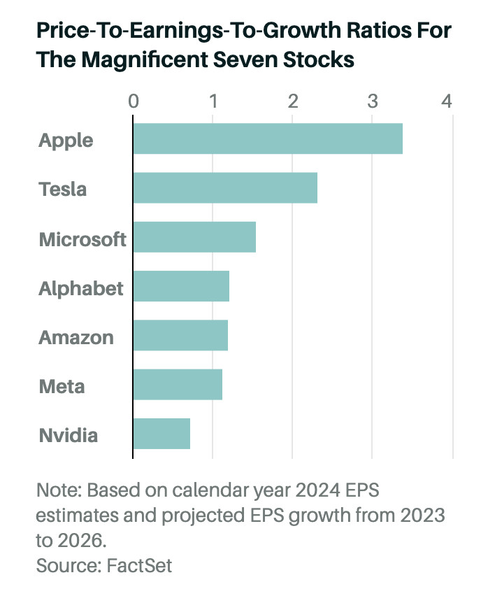 《巴伦周刊》使用基于FactSet预测的2023年至2026年预期平均盈利增长,以及基于2024年预测的市盈率,对美股7大巨头企业的PEG比率(市盈率除以盈利增长率)也做了预测,英伟达是其中最低的。