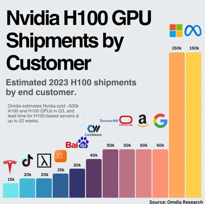 比如英伟达的大客户,主要是以Meta、微软、亚马逊、Google为代表的云计算平台。有媒体报道,头部云计算厂商在英伟达H100 GPU整体市场份额中的占比达到50%。