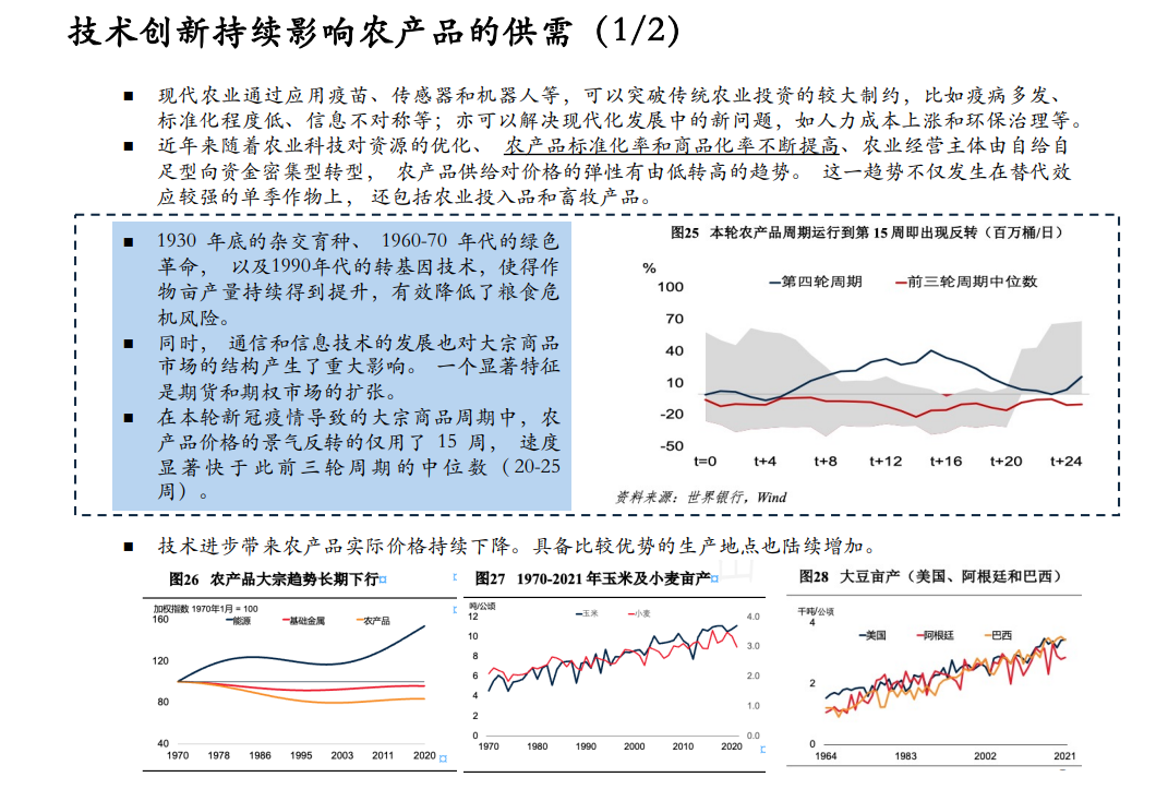 新冠疫情引发了我们对整个农产品周期的思考。传统观点认为,大约在24周后就不会再出现反转,但此次在第15周时,农产品价格景气周期就显著提升,产能恢复速度也较以往慢。在这段时间内,技术创新对农产品供给的弹性起到了明显的推动作用。长期来看,技术进步导致农产品实际价格持续下降,这在过去50年来是可观察到的。这种效率提升使得农产品供应更加充足,有时也会产生误解,即认为农产品价格必须上涨才能有希望。然而,事实上,农业价格的理论趋势是下降的,这才能反映出效率提升和技术进步的效果。