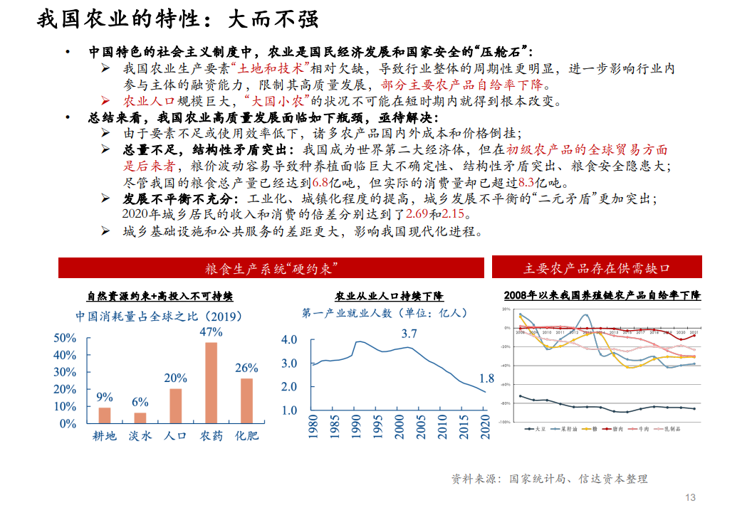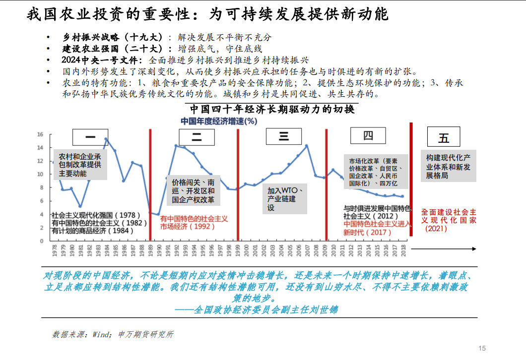 通过政策变化,了解投资方向。在2017年的十九大提出解决不平衡不充分的发展问题,到2022年的二十大,提出增强底气、守住底线的要求。2024年的一号文件从全面推进乡村振兴转向持续全面振兴乡村,这意味着要为乡村注入更多的活力。我们认为,构建社会主义现代化国家,农业现代化和建设农业强国具有重要意义和必要性。