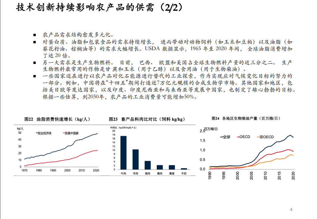 从需求端来看,技术创新和效率提升使得农产品需求结构更加多元化。举例来说,过去几十年,以蛋白质和油脂为代表的农产品需求增长迅速。从1965年到2020年,全球油脂消费增长超过了20倍。另一个明显的需求增长来自生物燃料,包括巴西、欧盟和美国,他们目前占据全球生物燃料产量的近三分之二。主要的生物燃料作物包括甘蔗和玉米。另外,食用油也是一个重要的需求领域。