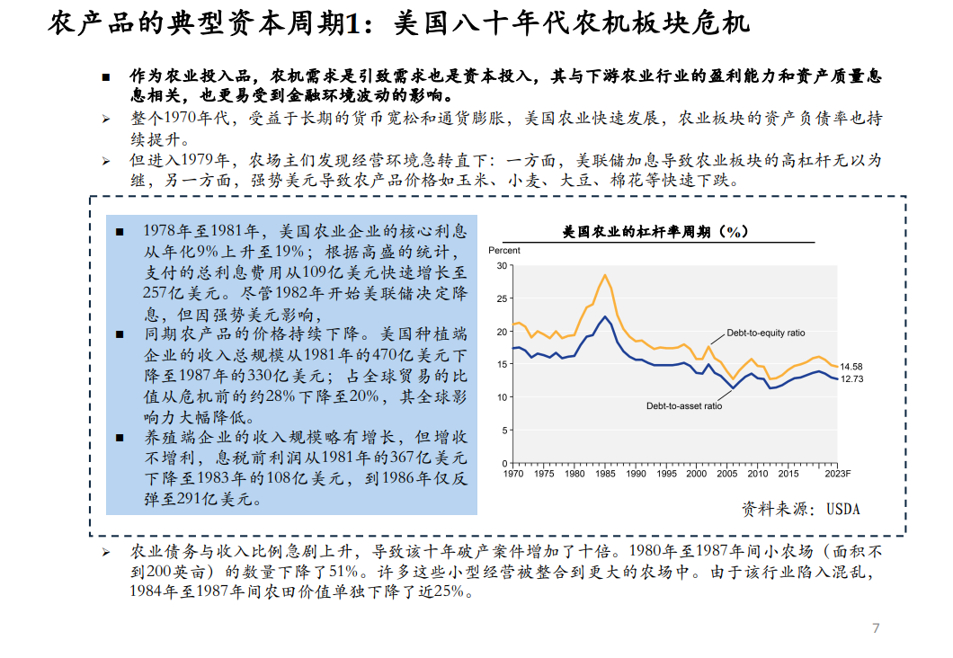 此前,美国农业的杠杆率非常高。在80年代初,农业板块的高杠杆变得难以为继,美联储加息导致农业企业的核心利率从年化的9%直接上升到19%。其总利息支付费用从109亿美元迅速增长到257亿美元。这一情况叠加了农产品价格持续下跌的影响,导致整个农业板块基本都亏损。在此期间,即1980年到1987年,美国农业相关的破产案件增加了十倍。小农场数量下降了51%,农田价值下降了25%。