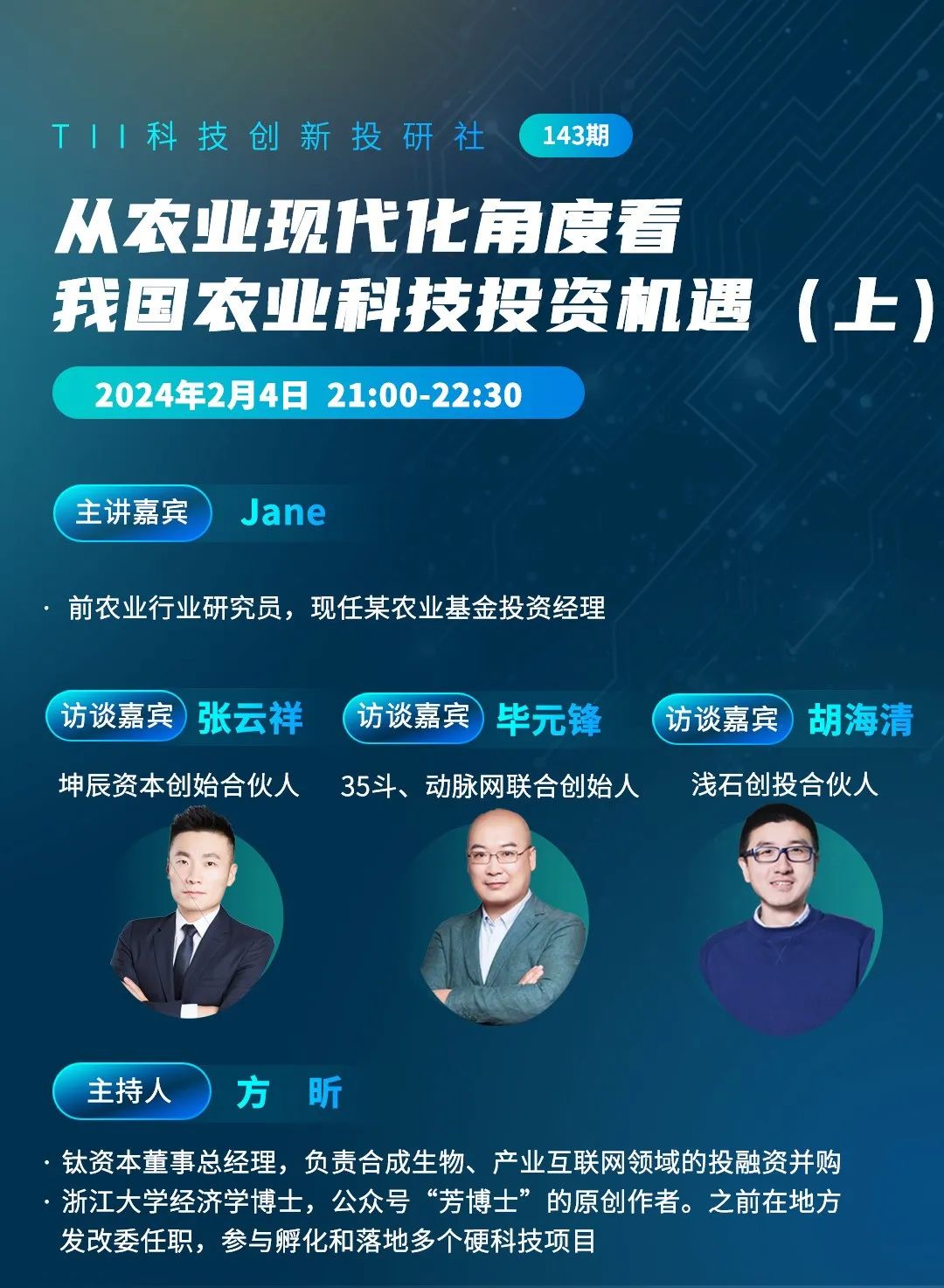农业科技领域可以关注哪些细分方向,未来有何发展趋势?近期钛资本邀请多位嘉宾就农业科技领域展开深度探讨,主题是:从农业现代化角度看我国农业科技投资机遇。主讲嘉宾是前农业行业研究员Jane,现任某农业基金投资经理,她长期在农业领域从事行业分析工作,参与了大量投资和并购项目,提供更具战略性的视角。参与讨论的访谈嘉宾包括:坤辰资本创始合伙人张云祥,35斗、动脉网联合创始人毕元锋,浅石创投合伙人胡海清。本次分享主持人是钛资本董事总经理方昕,她负责合成生物、产业互联网领域的投融资并购。以下为分享实录: