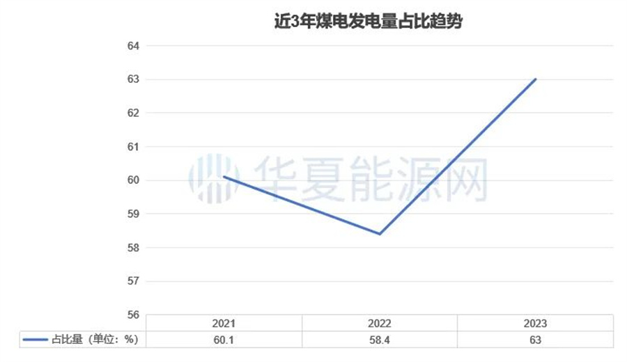 国资委和中电联双方的数据都显示,2023年煤电的发电量占比达到了63%。这个比例是有所抬头的——2022年,煤电发电量占比刚刚从上一年的60.1%降到了58.4%。