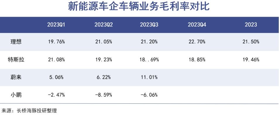 车辆销售毛利率是观察新能源车企的“灵魂指标”,2023年四季度,理想卖车业务毛利率上升到22.7%,全年车辆毛利率达到21.5%的历史高位。