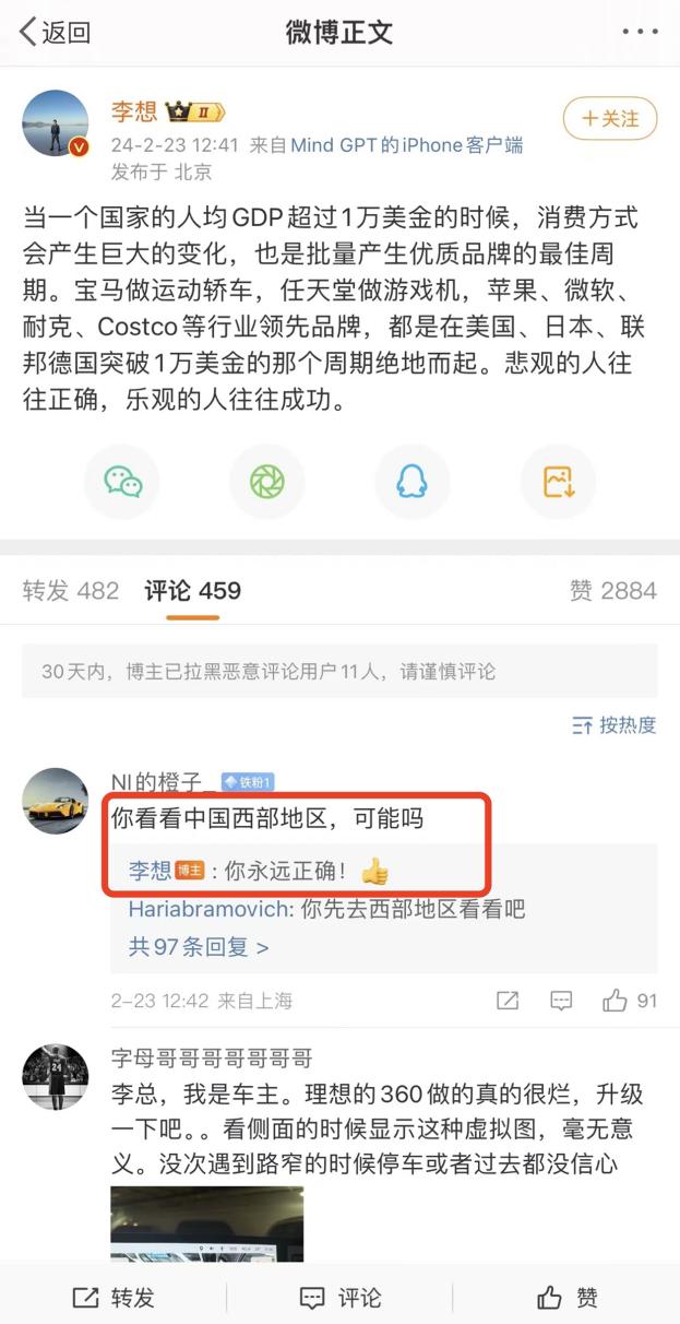 2月23日,李想曾发布微博称,一个国家的消费方式会在人均GDP超过1万美元时发生巨大变化,苹果、微软、宝马、任天堂、Costco 等知名品牌都是在这时产生,这是批量产生优质品牌的最佳周期。