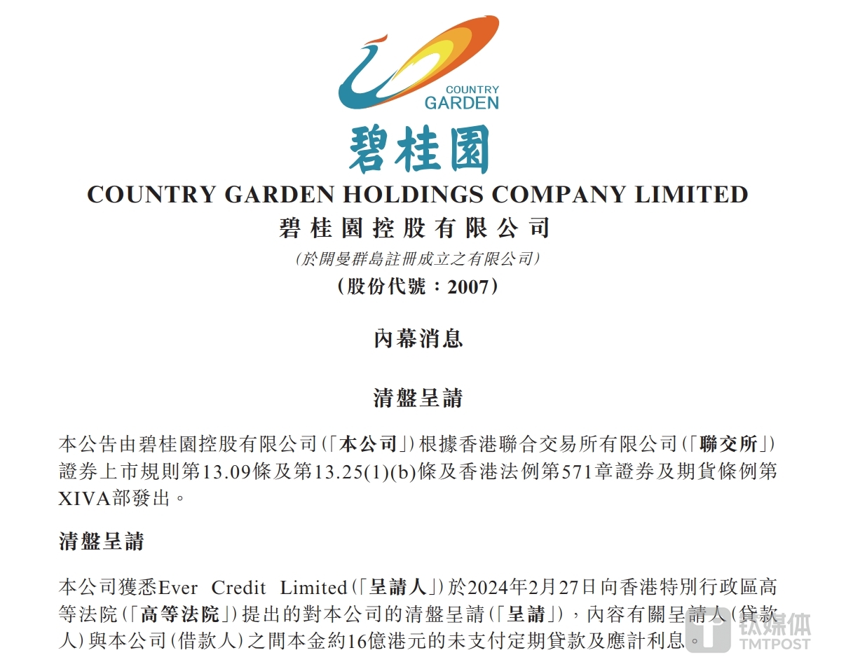 2月28日,碧桂园(02007.HK)发布公告称,公司获悉Ever Credit Limited(呈请人)于2024年2月27日向香港特别行政区高等法院(下称“高等法院”)提出的对本公司的清盘呈请,内容有关呈请人(贷款人)与本公司(借款人)之间本金约16亿港元的未支付定期贷款及应计利息。
