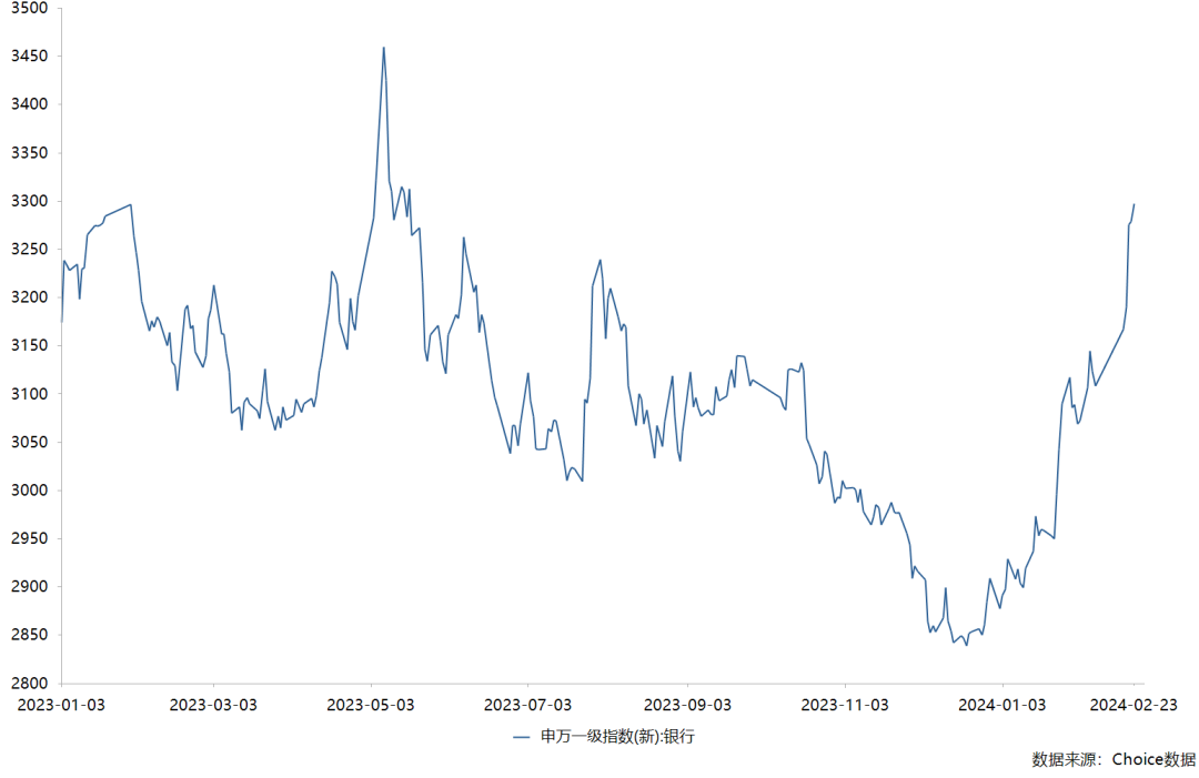 截至2月23日,申万银行指数由年初的2877.55点一路上涨至3297.12点,在两个月时间不够上涨了14.6%。此前,该指数由去年中的3459.66点一路下滑至去年末的2838.64点,半年时间左右下跌了18%。