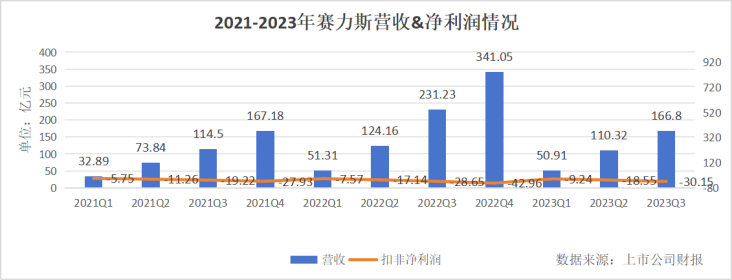回顾2021-2023年期间发布的财报,赛力斯在实现阶段性营收增长的同时,未能同步实现扣非净利润回正。按照1月末发布《2023年年度业绩预亏公告》,2023年预计营收355至365亿元,同比增长4.09%至7.02%;扣非净利润-50至-46亿元,亏损大势尚未扭转。