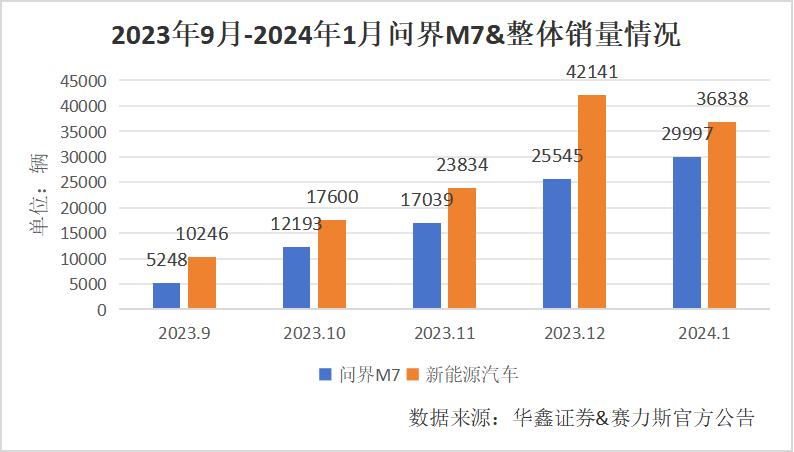 再看销量,仅以问界M7为例,参考华鑫证券发布的报告与赛力斯的官方公告,2023年9月-2024年1月期间,这款产品都是赛力斯销量的绝对主力。之所以9月占比最低,是因为该产品发布于月中(9月12日)。在问界的故事里,有太多太多的华为,却少了赛力斯自己。