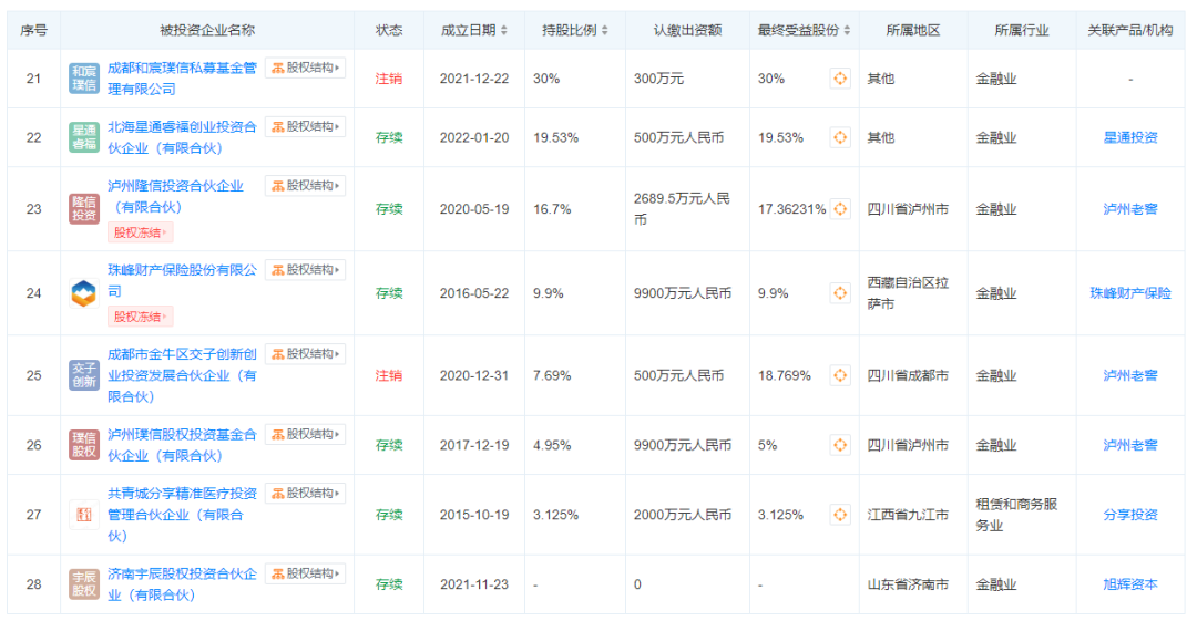 此前,四川璞信鲜少被公开报道,其开展的28次对外投资也多数指向投资和保险机构。