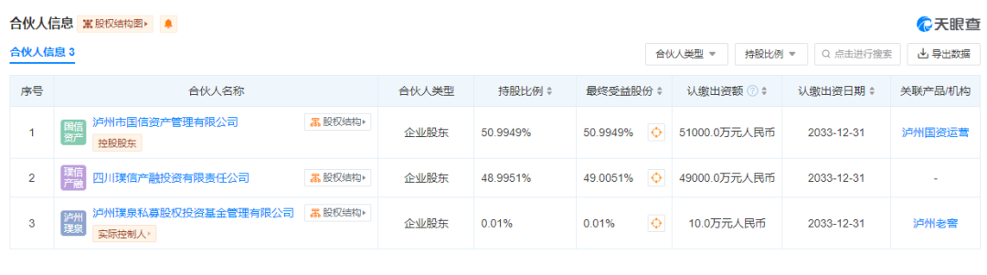 另外占股0.01%的泸州璞泉私募股权投资基金管理有限公司则为四川璞信的全资子公司。这也意味着,泸州老窖与泸州国资一起成为LP。