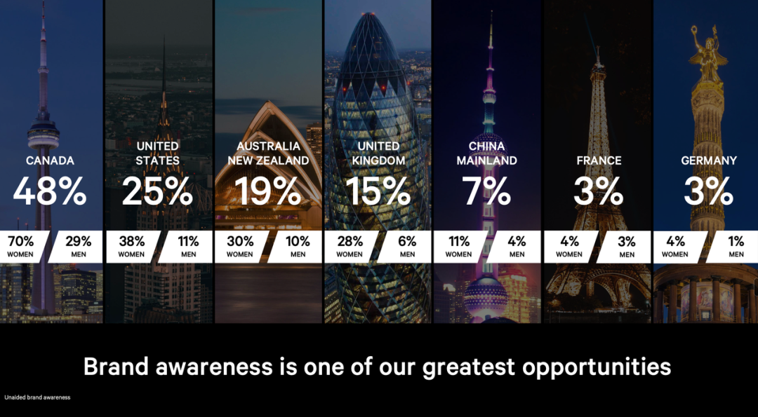 首先,lululemon曾经做过一次全球用户调研,数据显示北美市场的品牌认知度已经非常高了,而中国大陆仅有7%,这其中“地缘套利”的机会不言而喻。有小道消息称,早在2019年lululemon内部业务大会上,CEO就要花四分之一篇幅来讲中国市场。