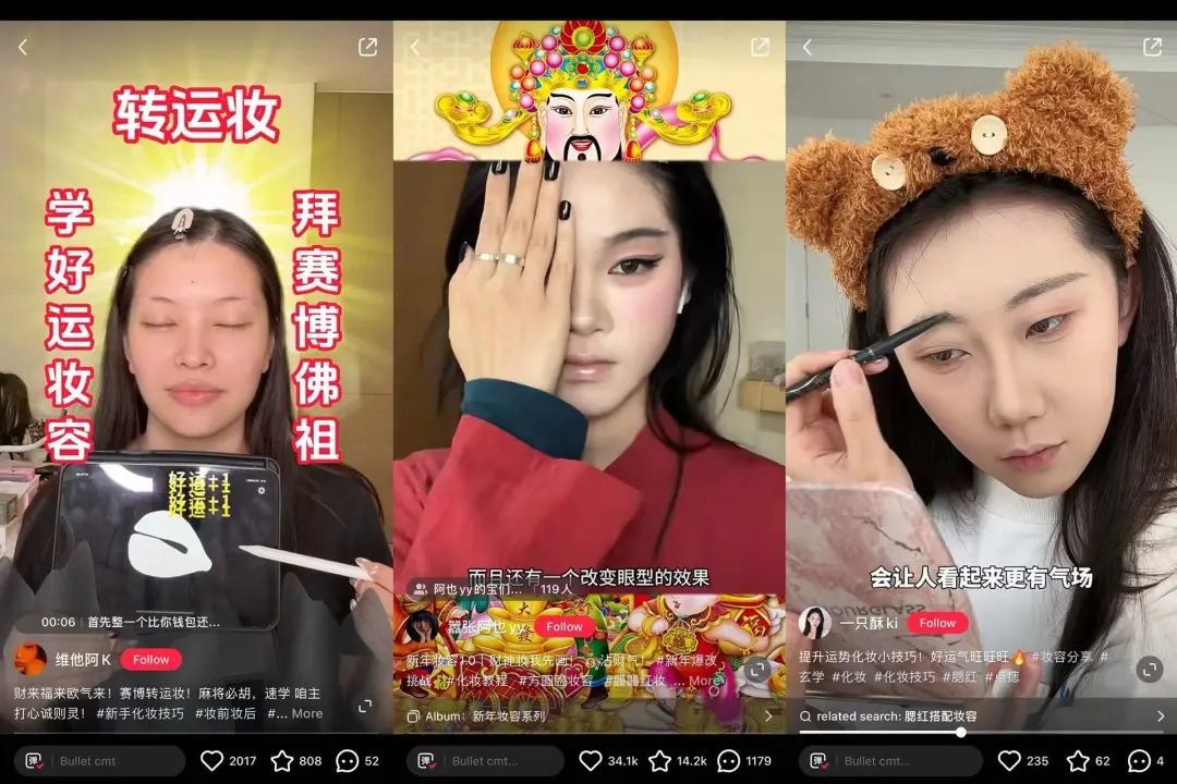 比如变美、变好的需求,小红书上曾流行一阵“玄学转运妆”,在博主的妆教视频中有各种讲究:底妆要清透,并注意遮痣,不然小心破财;要露出额头,因为额头是“官禄宫”;鼻头修圆、眉毛要连贯,眉尾要聚不能散;眉间距要不窄不宽,不能有断眉,鼻头下巴不能扫等。