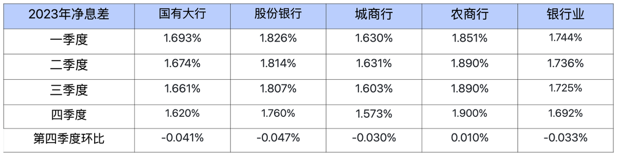 从下图中可以看到第四季度净息差环比降幅最大的是股份制银行,其次是国有大行。值得注意的是,央行在监管指标里披露的净息差并不是第四季度单季的净息差,而是前四个季度的平均净息差。有业内人士分析称,除了存量按揭下调带来的影响,负债成本也导致了净息差的超预期下降。