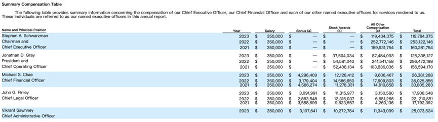 文件中还提到,为增强员工与公司利益的一致性,黑石在2007年就为某些符合条件的员工制定了奖金递延计划。在2023年,除苏世民以外的所有员工均未获得2023年奖金,均被选为参加奖金递延计划。其中,Jonathan Gray 2023财年的年度现金奖金支付也将被推迟。