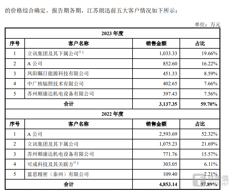 值得注意的是,公告显示,江苏朗迅的前五大客户占比从2022年的97.89%下降至2023年的59.7%,大幅降低,具体来看,主要是A公司的销售金额大幅缩减,其销售金额从2022年的2593.69万元缩减至2023年852.6万元。