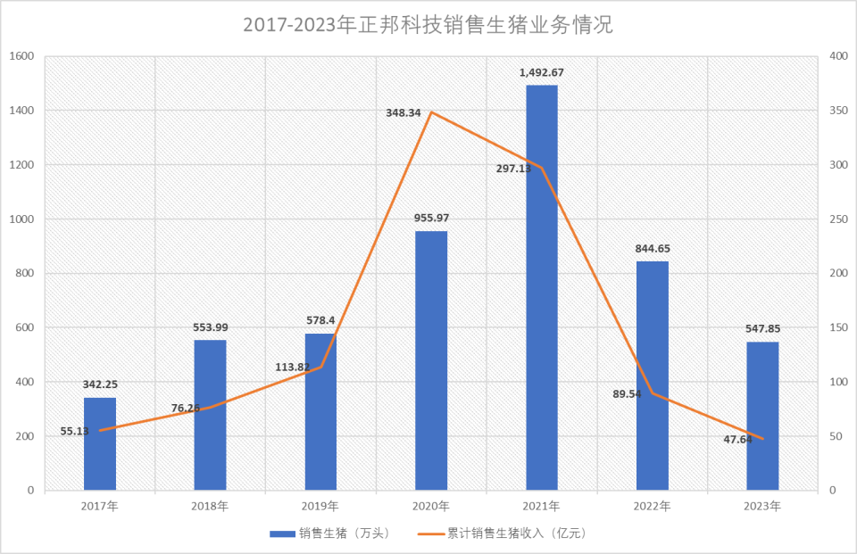 2022年,猪周期继续下行,正邦科技雪上加霜。当年,该公司销售生猪数量首次下降,达844.65万头,同比下降43.41%,销售收入为89.54亿元,同比下降69.87%。