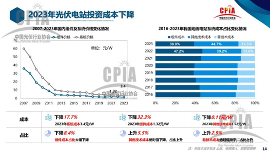 分布式光伏发展的两大因素,一是投资成本;二是电价政策。价格上来看,组件价格已低至0.8-0.9元/W,非常利好分布式光伏应用市场。2月28日,中国光伏行业协会名誉理事长王勃华表示,受组件价格下降的影响2023年光伏电站组件成本下降32.3%,同时系统成本也下降了17.7%。