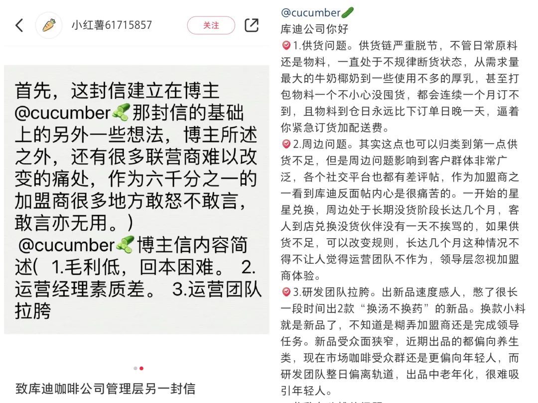 而库迪明显扩张受阻,低价营销极大压缩了利润空间,加盟商在社交媒体表示“毛利低、回本困难;运营团队拉胯”,且存在供应链脱节、供货不足和新品研发受众窄等问题。