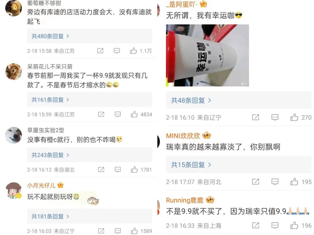 价格战的成功,是否带来了真正的用户粘性和品牌认可度?在此次优惠券缩水的声讨中,许多人表示,“瑞幸只喝9块9,超过就亏了”、“没有9.9元那就去喝库迪了”、“不会买超过9.9的瑞幸”。