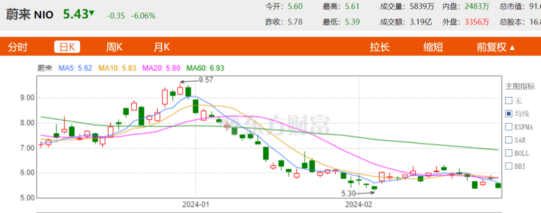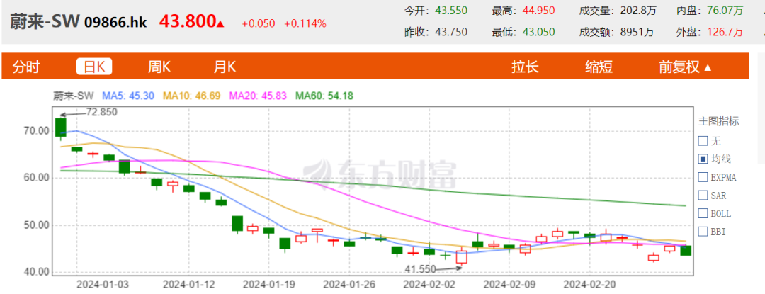 伴随上述诸多“降级”信号的是,蔚来汽车的股价在2024年开始至2月29日,已经从约72港元/股下降至43.8港元/股,开年2个月累计降幅已达39.79%,最新港股市值约687.9亿港元,约为理想汽车总市值的22%。