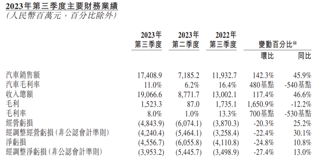 蔚来2023年3季度业绩报告显示,公司第三季度营收190.7亿元,环比增长117.4%,同比增长46.6%,现金储备452亿元,环比增加137亿元,净亏损约45.57亿元,环比下降24.8%