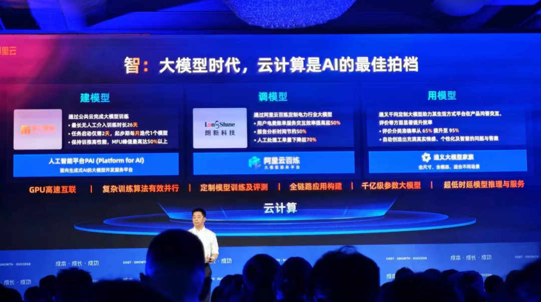 而在主题演讲环节,曾经阿里云的香饽饽,通义千问,只在演讲行将结束的节点,在一张PPT里占据三分之一不到的内容,不得不令人唏嘘。