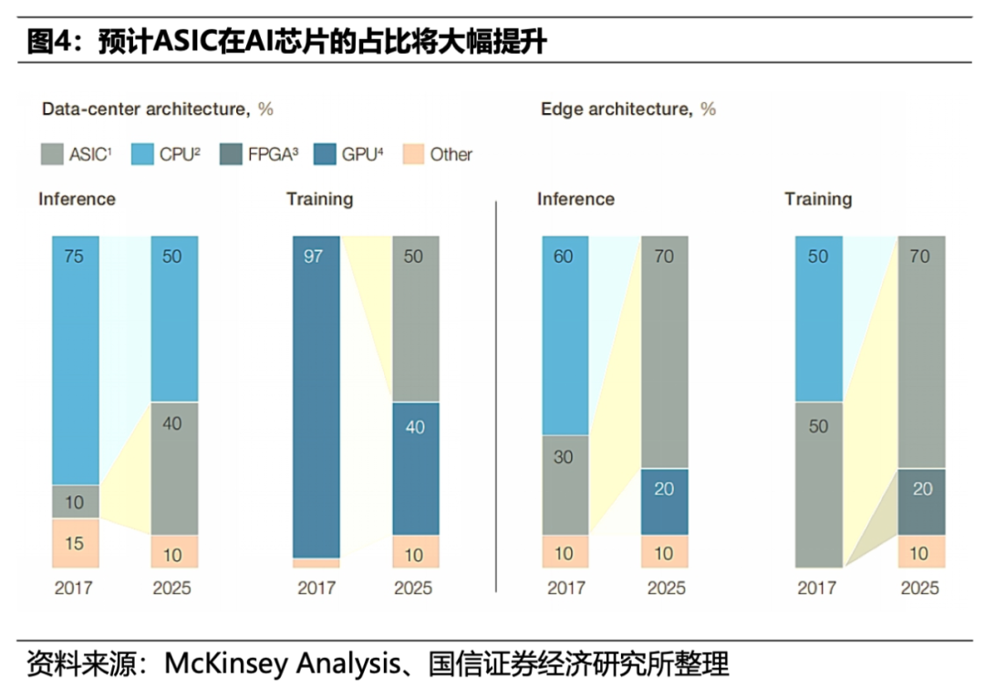 根据国海证券研报《GPT 5后NLP大模型逐步走向收敛,ASIC将大有可为》给出的数据,2025年ASIC在推理/训练应用占比分别达到40%、50%;在边缘侧,2025年ASIC在推理/训练应用占比分别达到70%、70%。