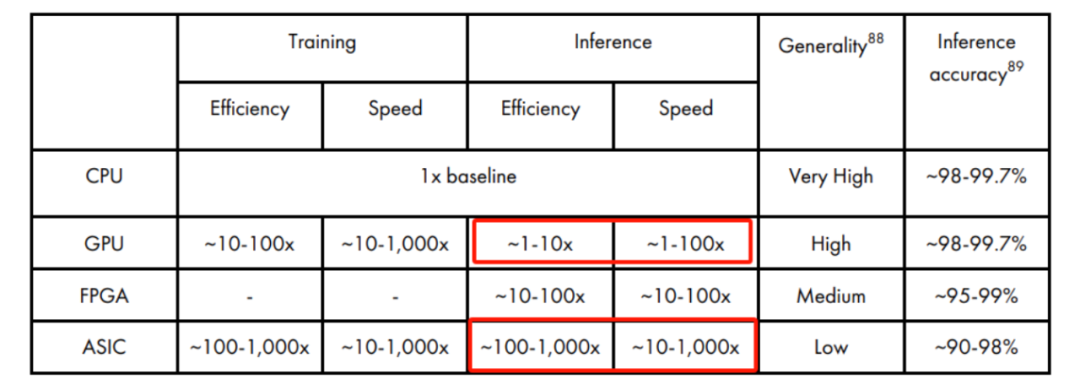 根据CSET报告《AI Chips: What They Are and Why They Matter》,相比CPU,ASIC芯片训练效率约为100-1000倍,速度约为10~1000倍。推理方面尤其好于GPU,见红框部分对比。