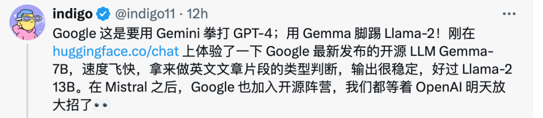 在模型发布后,Gemma也第一时间上线了 HuggingFace 和 HuggingChat,用户可以直接在这些平台上进行下载和试用。发布才几个小时,已有不少用户分享了试用体验,甚至部分用户还对其做出了很高的评价,社交平台X用户@indigo11称其“速度飞快”、“输出很稳定”。