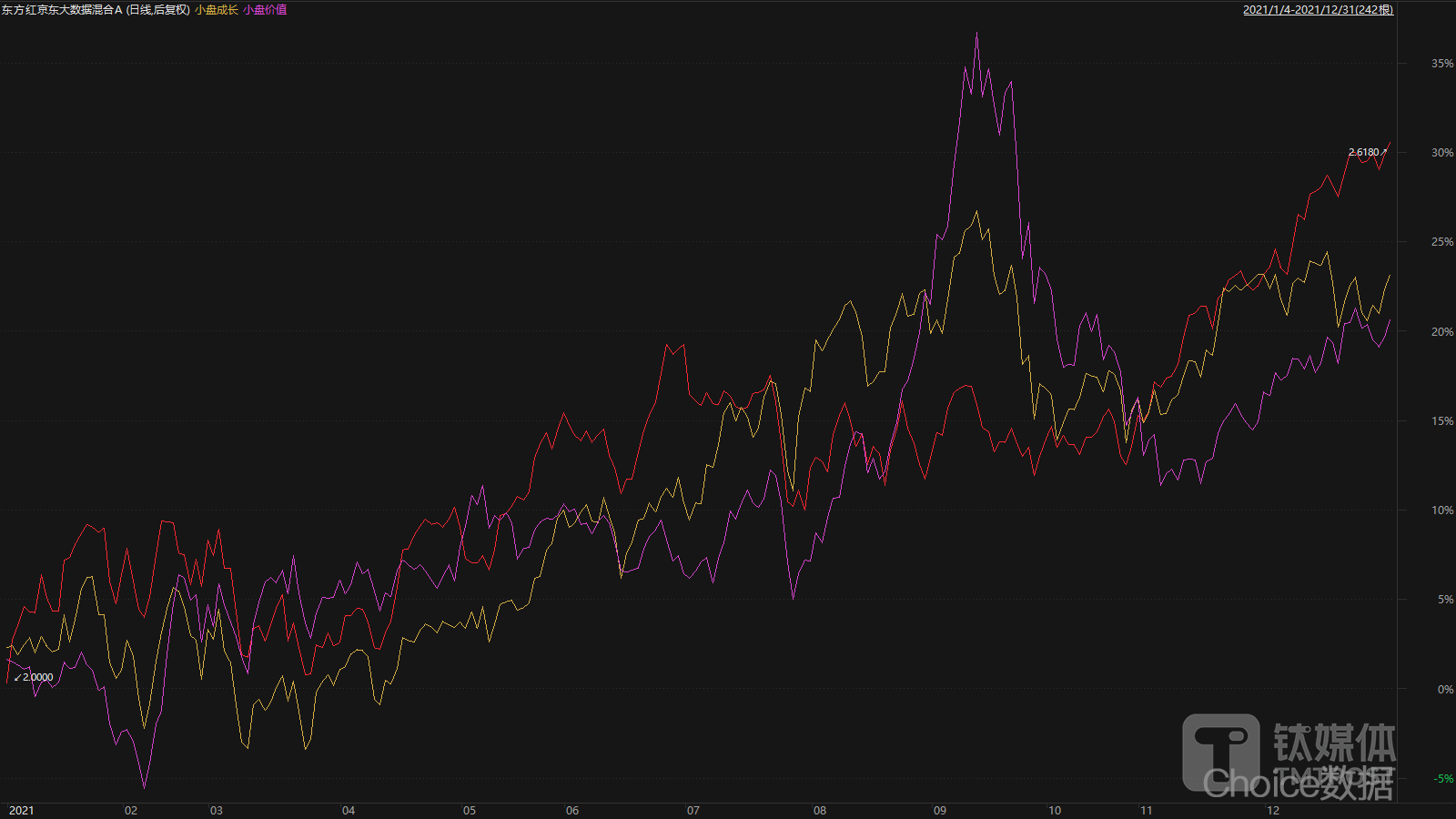 (相比于大盘风格,2021年,东方红京东大数据混合A更接近于小盘成长与小盘价值风格,数据来源:Choice终端)