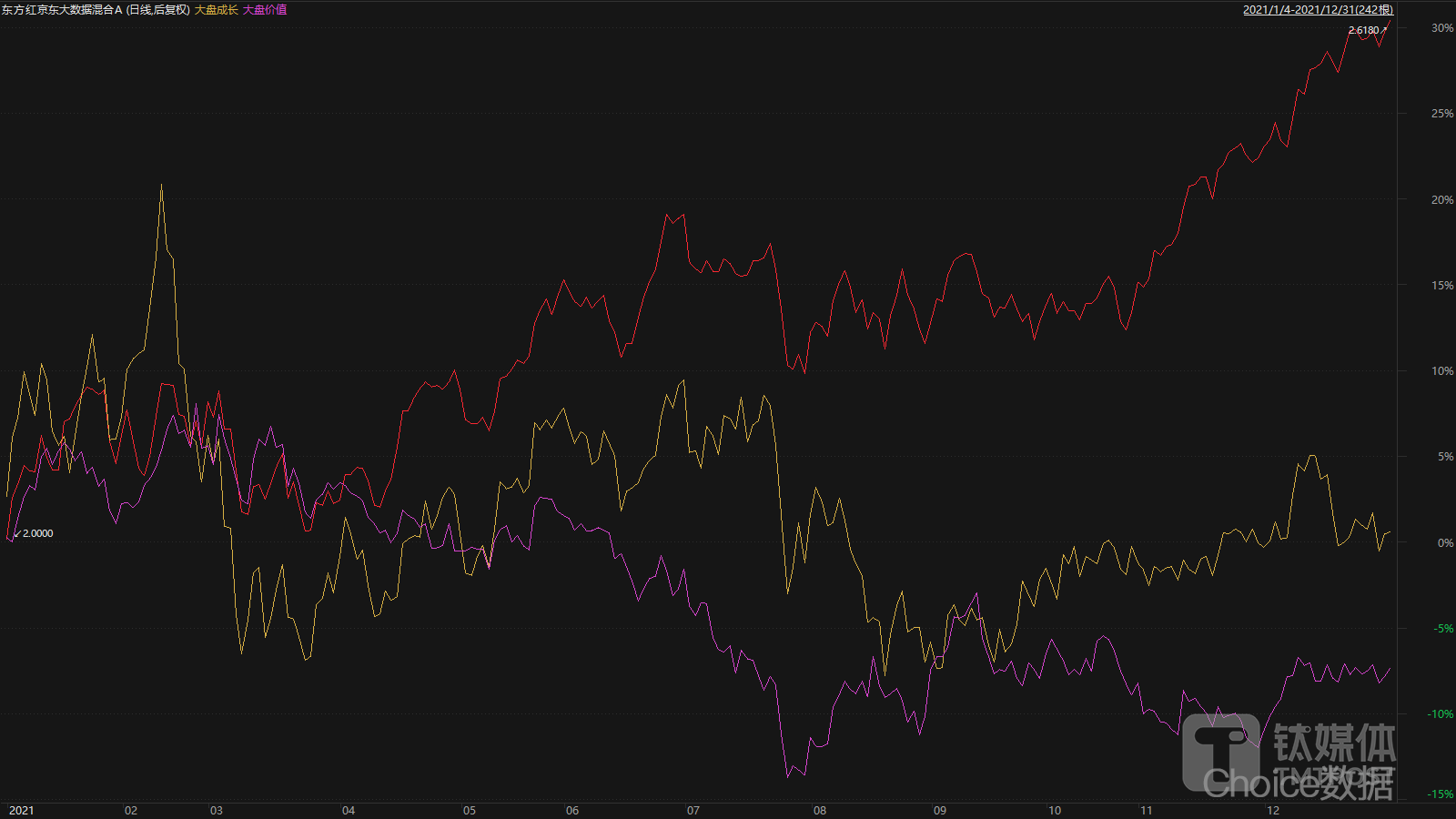 (2021年东方红京东大数据混合A的净值走势基本脱离了大盘成长与大盘价值这两种风格,数据来源:Choice终端)