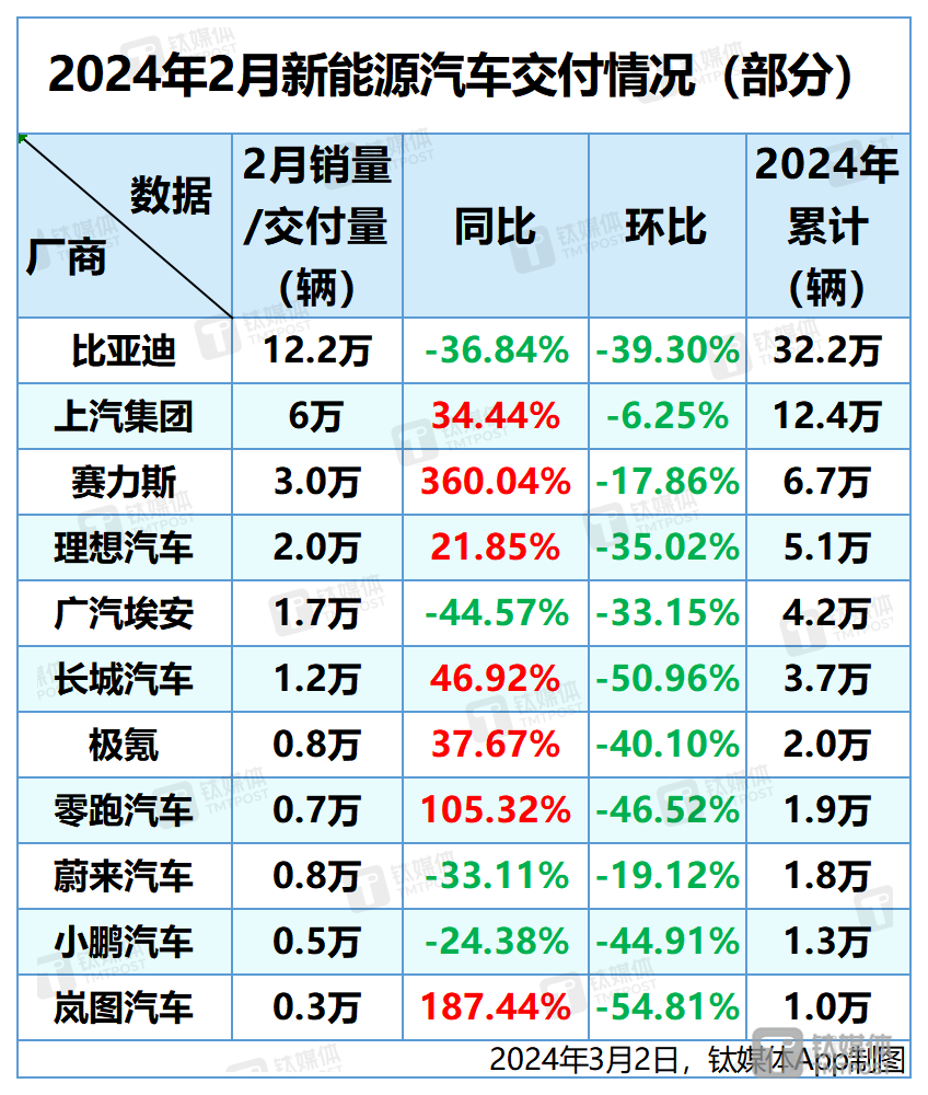 新能源汽车2月交付情况速览:3家同比增超100%,5家环比跌超40%