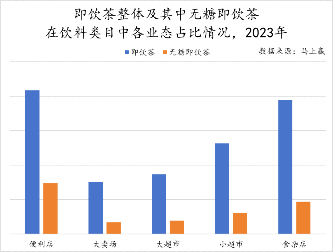 根据马上赢线下零售监测网络中的相关数据,即饮茶在小业态渠道,即便利店、食杂店及小超市中的份额占比相对较高,而在大卖场、大超市中则占比较低。无糖即饮茶在不同业态中的市场份额占比分布情况也与即饮茶大致相同,以小业态渠道为主,在大业态渠道的表现则有待提升。