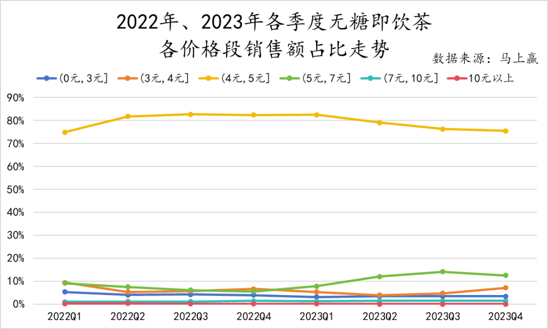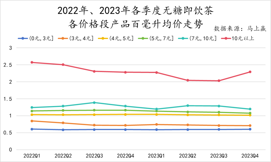 进一步观察无糖即饮茶的每百毫升均价走势可以发现,每百毫升均价基本与价格段正相关,大多数价格段产品的每百毫升均价波动较小、保持在相对稳定的价格水平上。10元以上产品则不同于此,其每百毫升均价最高时曾达2.5元左右,但在2023年Q2、Q3时则已下滑至2元左右,随后在Q4又有所回升。