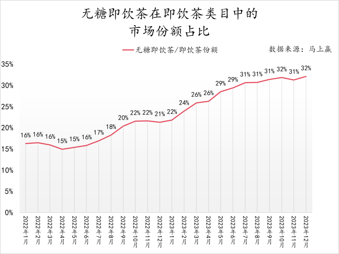 在即饮茶类目内部看,无糖即饮茶在即饮茶中的份额呈现明显的上升趋势,从16%提升至32%。可见对于即饮茶在整体饮料市场份额的提升而言,无糖即饮茶带来的增长是最大推动力。同时,无糖即饮茶的“大前提”和“小前提”同步增长,在增长的品类做有效的分化,预示着更宽广的成长空间。
