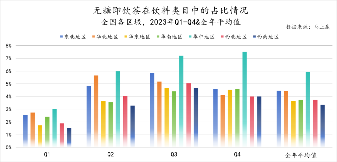 横向上看,无糖即饮茶在华中地区的市场份额占比在全年范围内均高于其他地区,尤其是在Q3、Q4两个季度,与其在东北、华北等地区的占比拉开了十分显著的差距。