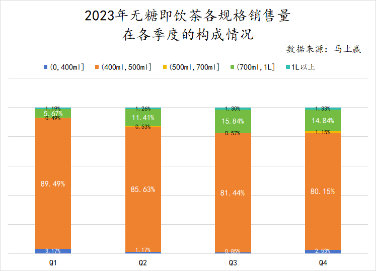 而基于需求端视角,(400ml,500ml]规格的销售量从Q1至Q4一路下滑,其销量占比下降约9%;而500ml以上规格产品则是来势汹汹,其销量占比从7.35%提升至17%左右,几乎全盘接手了(400ml,500ml]规格销量占比下降的部分。