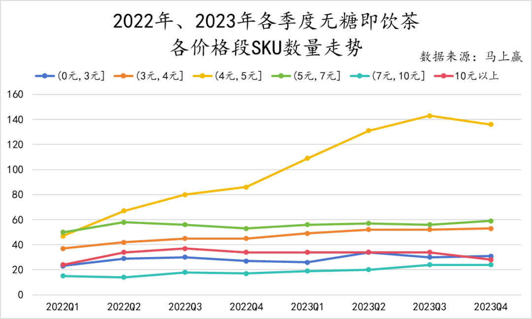 2022、2023两年间不同价格段SKU数量的变动则更能体现出4-5元产品在无糖即饮茶市场内的主要地位。对比销售额占比来看,2022年Q1期间4-5元与其他价格范围产品数量差距相对较小,但销售额占比却呈现出断层式领先。随后4-5元价格段SKU数量大幅上涨、新品不断推出,到2023年年末其SKU数已达到140款左右。而其余价格段产品的SKU数量则变化幅度相对较小,5-7元产品的销售额占比在SKU数相对稳定的情况下能够有一定的增长,也值得关注一二。