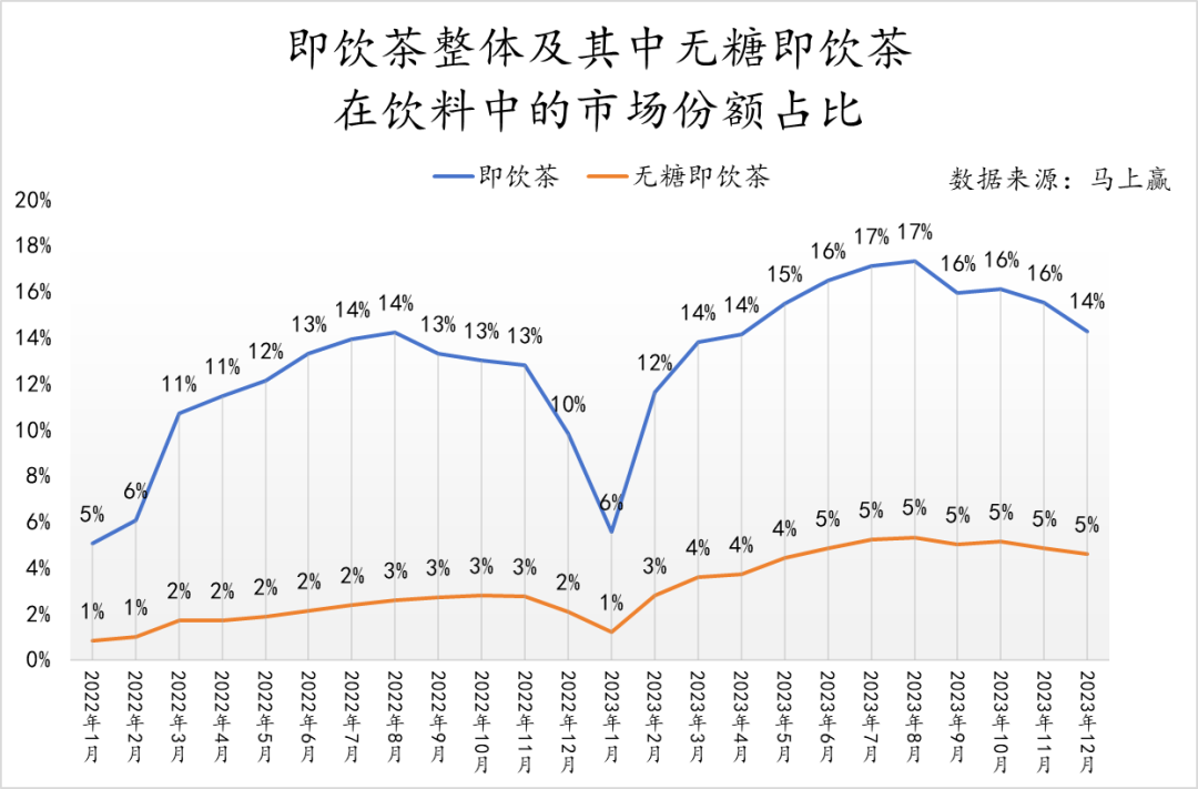 数据上看,以整体饮料为基础,从2022年1月至2023年12月,整体即饮茶同比2022年14%左右的峰值,2023年在旺季同期增长到峰值17%以上;而无糖即饮茶作为即饮茶中的一部分,也由2022年旺季3%左右的份额峰值,增长到了2023年5%左右的峰值市场份额。