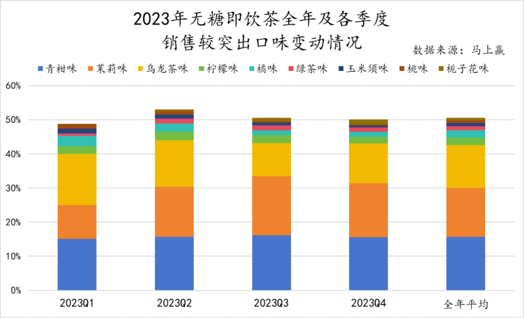 另外值得关注的是,三者所占份额在2023年期间有较为明显的变动。其中,茉莉味Q1时在三者之中虽占比稍低,但Q2、Q3保持市场拓展之势,这或许是因为茉莉味更加清爽,在炎炎夏日更加清凉解渴;青柑味与乌龙茶味同在Q1时占比较高,却在之后的三个季度中有不同程度的下跌,其中乌龙茶味的市场份额被挤占得较为显著,青柑味的市场份额波动相较之下更小——这或许是因为青柑味更加浓郁,虽然不如茉莉清爽但是对于爱好者而言一年四季冷热皆宜。