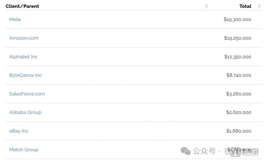 据OpenSecrets统计,2023年全球科技公司游说支出Top10依次为Meta(1930万美元)、亚马逊(1925万美元)、甲骨文公司(1324万美元)、谷歌母公司Alphabet(1235万美元)、苹果(986万美元)、微软(975万美元)、字节跳动(874万美元)、高通(722万美元)、英特尔(686万美元)和三星(630万美元)。