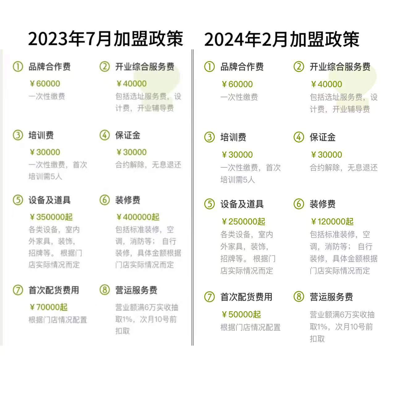 对比两次加盟细则,加盟投资金额的差距主要体现在设备及道具、装修费、以及首次配货费用上,合计差了40万。