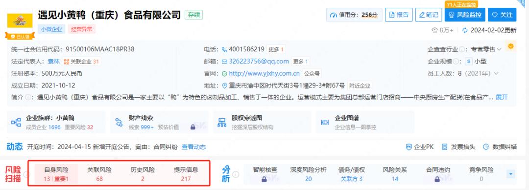 翻阅企查查则可以看到,目前遇见小黄鸭(重庆)食品有限公司该公司涉及劳动纠纷的案件已有13起,涉及的合同纠纷有4起,企查查上该企业的状态已经显示为“异常经营”。