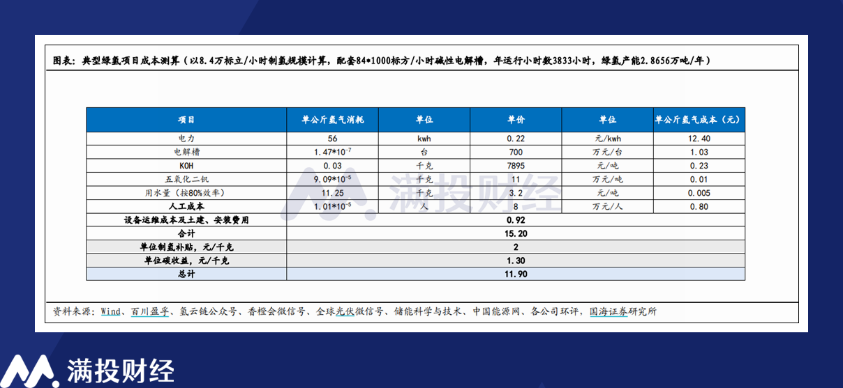 从电价角度来看,根据国海证券测算,使用电解槽制氢、煤炭制氢的发电/煤炭成本分别占总成本比重的66%、70%,依旧处于较高的比例。以风光耦合制氢项目为例,国海证券估算单位制氢成本在15.20元/千克,成本仍有进一步下降的需求。